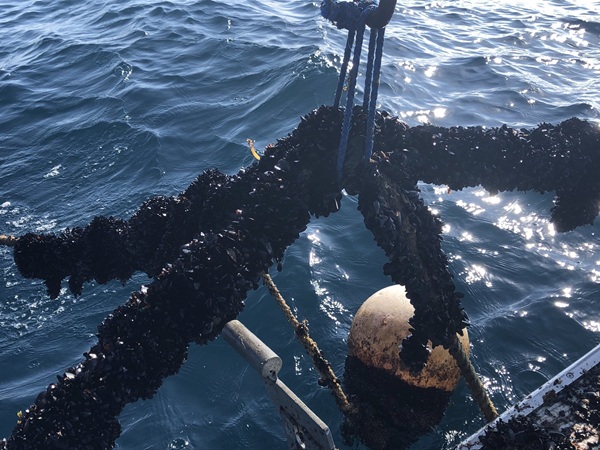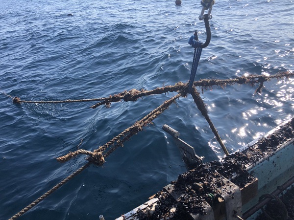 昆布養殖施設に張り付いた貝を叩き落す掃除が行われます。